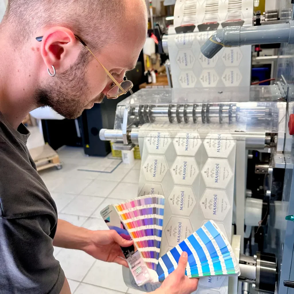Molti produttori hanno già un’idea o un grafico, ma cercano qualcuno che sappia stampare davvero bene, senza sorprese sui materiali o sulla resa finale. Noi facciamo proprio questo: studiamo insieme i materiali, facciamo le prove fisiche e stampiamo tutto internamente, senza passaggi intermedi.